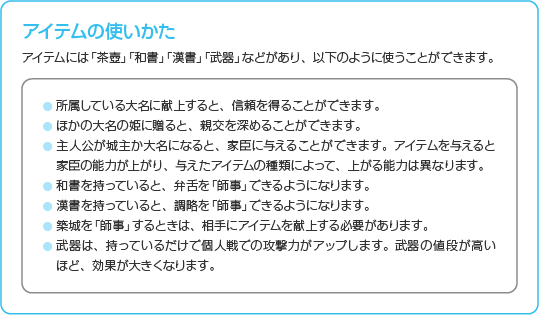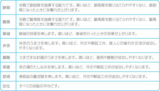 合戦や内政などに必要な能力です。技能の高さはA(最高)> B > C > D(身についていない)で表され、武将や茶人などに師事したり、馬屋や鉄砲鍛冶屋で下働きを行ったりすると上げることができます。 ![]() |