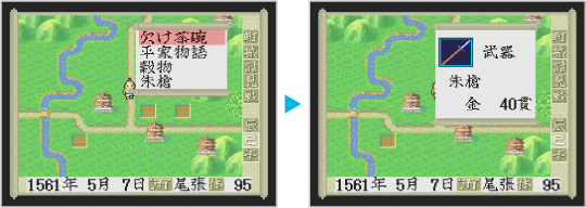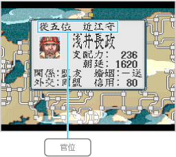 大名が取得している官位や支配力、主人公が所属している大名との関係などを確認できます。 |