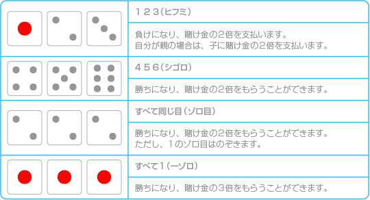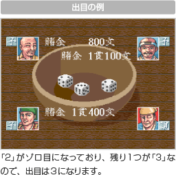 3個のサイコロを使って、4人で勝負する賭博です。初めに賭ける金額を設定してください。続いて、2個以上のサイコロがゾロ目になるまで、サイコロを振ります(親は4回まで、子は3回まで振り直すことができます)。ゾロ目以外の残り1個のサイコロの目が「出目」になります。 これを親から子の順番に行い、親の出目よりも自分の出目が大きければ勝ちとなり、賭け金を獲得できます(自分が親の場合は、自分の出目が子の出目より大きいと勝ちです)。ただし、以下の目を出すと、その場で勝負が決まります。 ※引き分けは親の勝ちです。 |