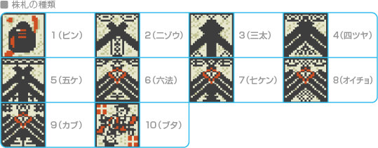 親と1対1との勝負です(親にはなれません)。初めに賭ける金額を設定してください。続いて株札が2枚配られるので、2枚の数を足してください。合計数の1ケタ目の数が大きいほど強くなります。数を確認したら、3枚目をもらうかどうかを選びましょう。2枚または3枚の合計数の1ケタ目を出し、勝敗を決めます。ただし、以下の札をそろえると、自動的に勝負が決まります。