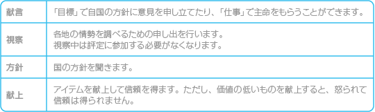※主命実行中や他国の視察を行っている間は、評定に参加しなくても、信頼は下がりません。 |