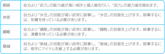 織田家の武将に師事して、技能を高めます。以下の4つから選んでください。 |