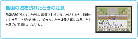 他国の大名の居城に行ったときに選ぶことができ、姫に会うことができます。アイテムを贈ったり、世間話をして親しくなっておくと、外交交渉の際に口添えを頼めるようになります。 |