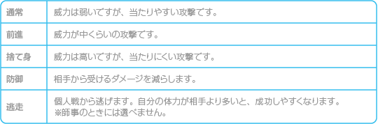 以下の5つから個人戦コマンドを選んでください。「通常」「前進」「捨て身」を選んだときは、バーのカーソルも止めてください。 ![]() |