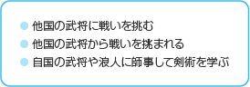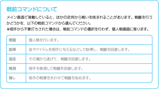 武将と戦うときや剣術を「師事」するときは、個人戦になります。1対1で戦って、相手を倒してください。 |