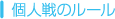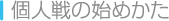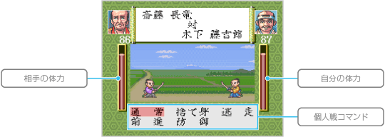 相手と自分の体力や個人戦コマンドなどが表示されます。個人戦コマンドを選び、戦闘を進めてください。 ![]() |