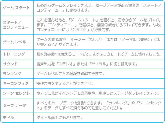 ※メインメニュー画面で「セーブ データ」を選んでデータを削除すると、「ランキング」や「シーン セレクト」のデータもすべて消えてしまいます。