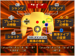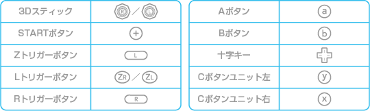 「キーコンフィグ」を選ぶとニンテンドウ64のコントローラが表示されます。クラシックコントローラで対応するボタンは以下のとおりです。 |