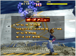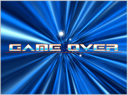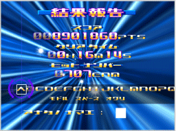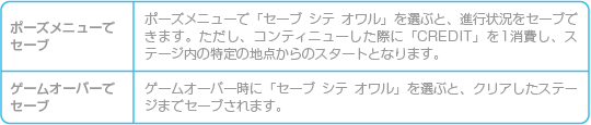 ランキングの登録が終わると、コンティニュー画面に移ります。「コンティニュー」か「セーブ シテ オワル」を選んでください。なお、コンティニューには「CREDIT」が必要です。 |