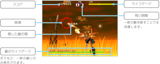 敵を倒しながらステージを進みましょう。 ステージのボスを倒すとステージクリアとなり、次のステージに進みます。 ![]() |