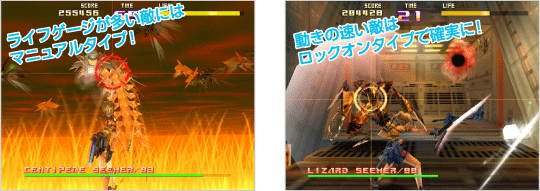 「マニュアルタイプ」は、自分で敵に照準を合わせる必要がありますが、敵に与えるダメージが高くなります。 「ロックオンタイプ」は敵に与えるダメージが低いですが、敵へ照準が自動的に合います。 それぞれの特徴を活かし、使い分けましょう。 ![]() |