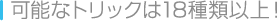 | メソッドやステイルフィッシュなどの手でボードをつかむ「グラブ系」トリックや、ワンエイティ、スリーシックスティといった高速で回転する「スピン系」トリックなど、技のバリエーションは実にさまざま。空中でタイミングよくコマンドを入力すれば連続トリックも可能です。お気に入りのトリックを組み合わせ、オンリーワンのジャンプをめざそう! | ![]() |