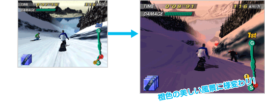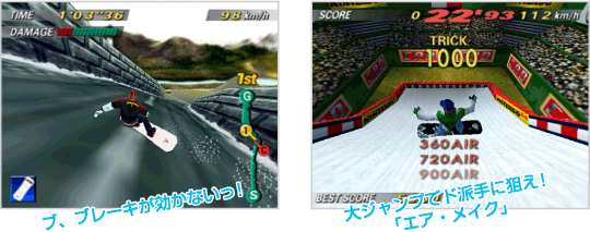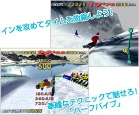 舞台となるコースは林間や氷結した川の上、街の中と実に多彩です。氷の上ではブレーキやターンが効きにくかったり、パウダースノーでは足がとられて転倒しやすいなど、さまざまな場面で滑り方を考えていく必要があるでしょう。また、「トリック・アタック」や「コンテスト」に登場するハーフパイプとエア・メイクは、トリックを練習するのに最適なコースです。コマンド入力やジャンプのタイミングを覚え、空中で最高のパフォーマンスを披露してください。 ![]() |