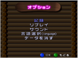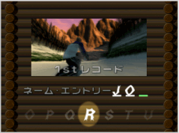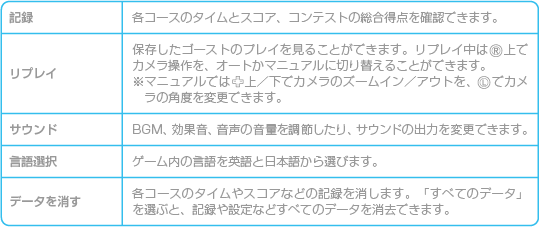 「2P対戦」以外の各モードでは、コースクリア時のタイムやスコアが3位以内に入ると、ネームエントリー画面で名前を入力してコースの記録を保存できます。 データを消す場合は、「オプション」の「データを消す」で行ってください。 なお、一度消したデータは元にもどらないので注意しましょう。 |