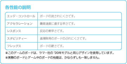 本ゲームに登場するボードです。ボードの性能は特性を表しており、優劣を示すものではありません。