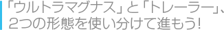 このゲームの主人公ウルトラマグナスは、トレーラーにトランスフォームしたり、トレーラーからウルトラマグナスにトランスフォームすることができます。それぞれの形態でできることが異なるので、ステージや敵によってタイミングよくトランスフォームすることが大切です。 ![]() |