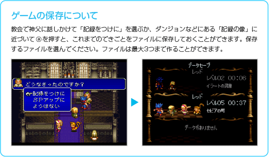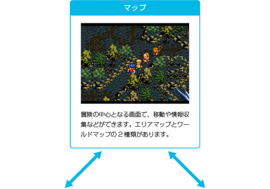 マップで主人公のレッドたちを操作して世界中の街やダンジョンを冒険し、物語を進めていきましょう。敵に遭遇するとバトルになります。また、マップで