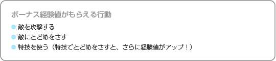 | バトルに勝利すると仲間キャラクター全員が経験値をもらえますが、HPが0になって気絶してしまったキャラクターはもらうことができません。最後まで気絶しないように気を配って戦いましょう。また、バトル中に以下のような特定の行動をしたキャラクターは、その場でボーナス経験値をもらえます。早くレベルアップさせたいキャラクターがいるときは、積極的に特技を使わせたりして、効率よく経験値を稼ぎましょう。 | ![]() |