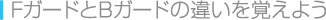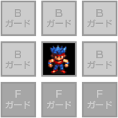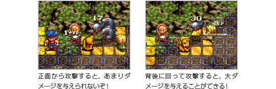 キャラクターにはそれぞれ「Fガード」と「Bガード」という2種類の防御力があり、バトルで正面やナナメ前から攻撃されるとFガード、背面や横面、ナナメ後ろから攻撃されるとBガードが働きます。攻撃をするときは、向いている方向にも気をつけましょう。基本的にFガードよりもBガードの方が低いため、敵を攻撃するときはなるべく背後から、仲間が攻撃を受けるときはできるだけ正面からになるように移動させるのがコツです。 |