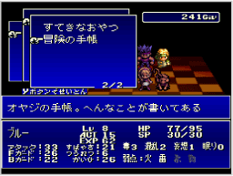 | レッドとブルーの父親、ブラウンが残した「冒険の手帳」には、さまざまなことが書いてあります。冒険に行き詰まったら、この手帳を見てみましょう。意外なヒントが書いてあるかもしれません。手帳を見るときは、メニューの「もちもの」でブルーのアイテム「リュックサック」を選び、続いて中にある「冒険の手帳」を選んで「つかう」を実行しましょう。 | ![]() |