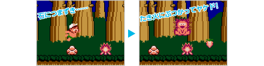 | 「高橋名人」と言えば、1秒間にボタンを16連打するテクニックの持ち主として知られる実在の人物です。ゲーム名人として子どもたちに人気があり、数々のテレビ番組に出演したり、映画の主役になったり、ゲームの主題歌を歌うなど、マルチな活躍をされていました。その人気を受けて1986年9月12日に発売されたアクションゲームが、本作『高橋名人の冒険島』です。 | ![]() |