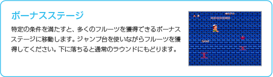 各ラウンドにはフルーツや石オノなど、さまざまなアイテムがあり、取ることで名人がパワーアップします。一部のアイテムはタマゴの中に隠れているので、見つけたら割ってみましょう。そのほかに、特定の行動で出現するものもあります。 |