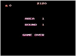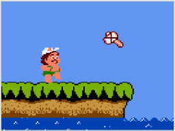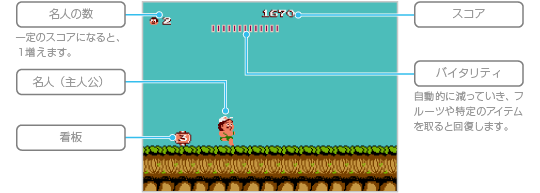 「バイタリティが0になる」「敵や敵の攻撃に当たる」「転がる岩やたき火に当たる」「穴などに落ちる」とミスとなり、名人の数が1減って最後に通過した看板から再開します。名人の数が0のときにミスをするとゲームオーバーとなり、タイトル画面にもどります。 |