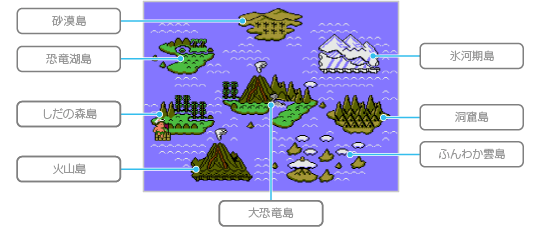 高橋名人が巡るのは「しだの森島」「恐竜湖島」などの8つの島です。それぞれの島には、緑が多い、大きな湖があるなどの特徴があり、登場する敵や仕掛けが異なります。 ![]() |