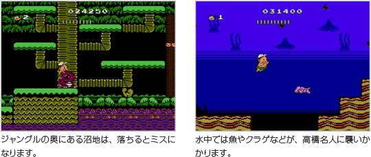 島にはいくつかのステージがあり、高橋名人は木の茂るジャングルや、薄暗い洞窟の中などを進んでいきます。また、島によっては水中を泳いだり、氷上を滑って進むことになります。 ![]() |