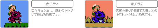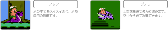 冒険の途中では、恐竜たちに乗ることができます。恐竜に乗ると、空を飛んだり、水中を泳いだりして進むことができます。 ![]() ![]() |