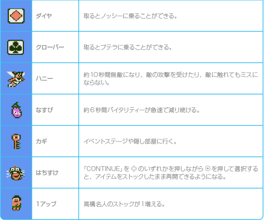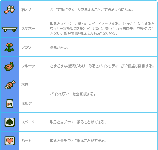 ステージに登場するたまごを割ると、中からアイテムが出てきます。イベントステージや隠し部屋で手に入るものもあります。