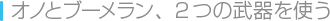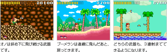 高橋名人が使用できる武器は「オノ」と「ブーメラン」の2つ。2つの武器はアイテムを取ることで使えるようになり、使用中のアイテムを取ると連射できる数が増えていきます。 ![]() |