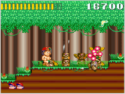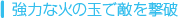 武器が3連射できるときに使用中の武器を入手すると、武器は「火の玉」にパワーアップします。火の玉は「オノ」や「ブーメラン」で壊せなかった小さい岩を壊すことができます。 |