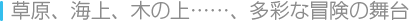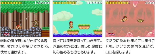 高橋名人は、草原や海上、洞窟など、さまざまな場所を冒険します。草原ではスケボーで滑走する、洞窟では岩に追われる、といったスリル満点の仕掛けを乗り越えて進んでいきます。 ![]() |