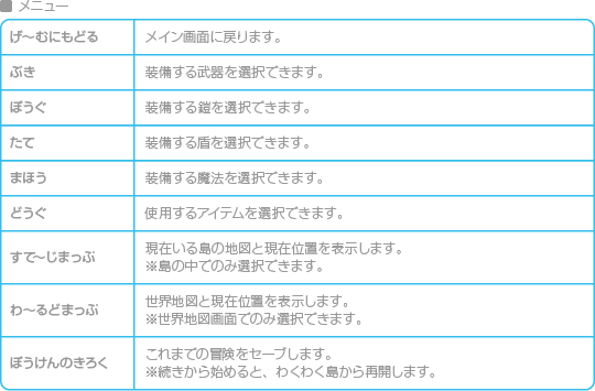 島を探索するときはメイン画面が表示されます。サブ画面は、装備を変更するときなどに使います。 |