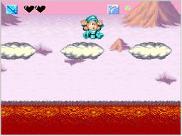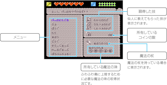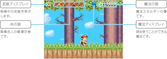 ハート型の命の器は、高橋名人の健康状態を示します。「敵の体や攻撃に当たる」「落下してくるつららなどに当たる」「溶岩の上などに落ちる」とダメージを受けて、命の器の中身が減ります。命の器がすべて空になる と、ゲームオーバーです。 命の器は、敵が落とす命の元(赤のビン)を拾う、魔法を使う、宿屋や温泉を利用するといった方法で回復できます。 |