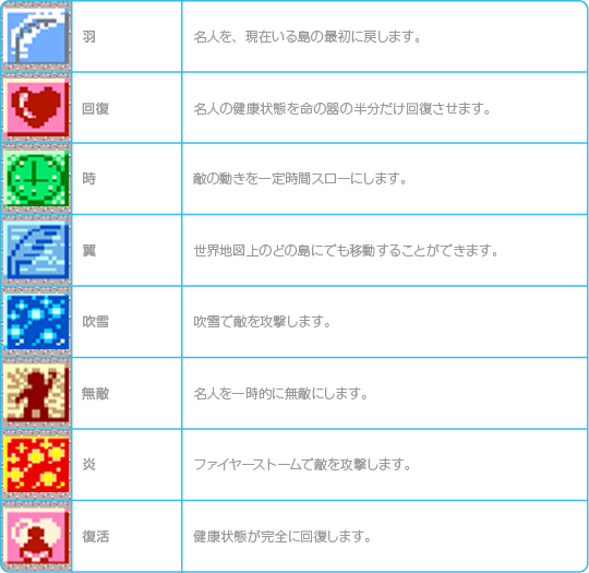 敵を攻撃する魔法や島を移動するときに使う魔法など、さまざまな種類があります。