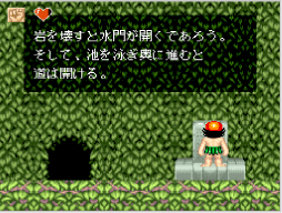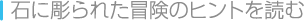 | 島を探索していると、文字が掘られた石を発見することがあります。行く手をはばむ仕掛けを解く方法など、冒険のヒントが書かれているので、見つけたら読むようにするのがオススメです。 | ![]() |