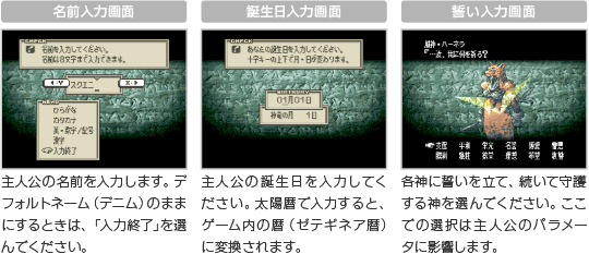 ゲームを最初からプレイします。「ゲームをはじめる」を選び、主人公の名前、誕生日、神々への誓いを入力してゲームを始めてください。「プレイする前に」を選ぶと、「TUTORIAL」に移ります。 ![]() |
