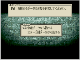 データを保存した場所からプレイします。中断データから始めるときは「中断データから続ける」を、通常のセーブデータから始めるときは「ステージ間データから続ける」を選んでください。なお、中断データは一度「中断データから続ける」を選ぶと消えてしまうので注意してください。 |