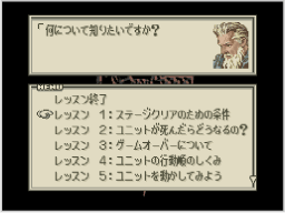 戦闘の基本ルールや操作方法などを見ることができます。見たい項目を選んでください。「レッスン終了」を選ぶとタイトル画面に戻ります。 |
