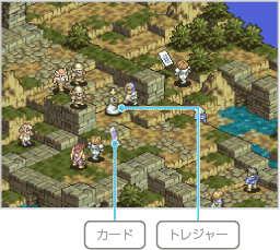 敵を倒すと、アイテムやお金が入った「トレジャー」や、ユニットのパラメータが上がる「カード」を落とすことがあります。この2つはユニットをその場所に移動させると回収することができるので、現れたら取りにいってください。
