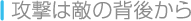 攻撃で敵に与えるダメージは、お互いが向いている方向が重要なポイントになります。敵の背後から攻撃すると、正面から攻撃するよりもヒット率を大幅に上げることができます。また、背後からの攻撃には劣りますが、左右からの攻撃でも正面よりもヒット率が上がるので、敵の向きをよく見て移動先を決めてください。 なお、逆に敵からの攻撃を受けるときも上記の条件が当てはまります。敵に背後を取られないように注意してください。 |