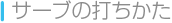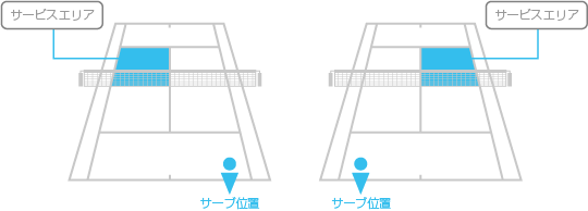 サーブ位置によって、サーブを入れる場所(サービスエリア)が異なります。下の図の青いエリアにボールが入るよう、サーブを打ってください。 ![]() |
