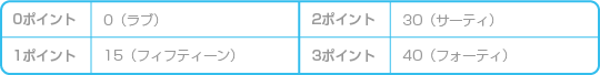 4ポイント先取すると1ゲーム取得できます。ただし、40-40の場合はデュースとなり、どちらかのプレイヤーが2ポイント差をつけるまで試合を続けます。 |