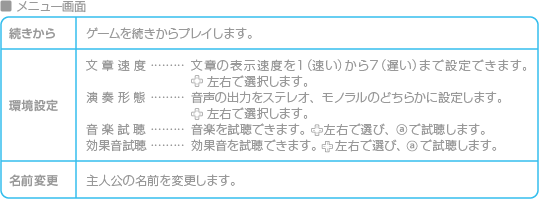 セーブデータを選んで続きからプレイできます。セーブデータ選択後に以下のメニューが表示され、プレイ環境の設定や主人公の名前の変更ができます。