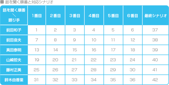 で決定します。誰に、何番目に話を聞くかでシナリオが1から42まで変化します。最終シナリオは、6番目に誰を選ぶかで変わります。