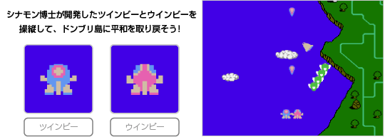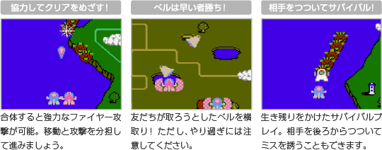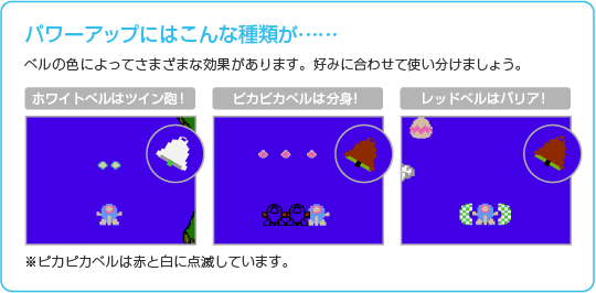 『ツインビー』は、2人でツインビーとウインビーを操作して遊ぶこともできます。協力プレイはもちろん、ベルの取り合いやちょっとしたいじわるで相手をミスさせるなど、さまざまな遊びかたが楽しめます。 ![]() |