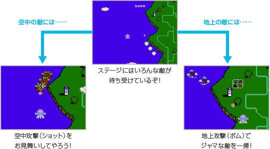 次々と襲ってくる敵を倒しながら進み、最後に登場するボスを倒してステージをクリアしましょう。プレイヤーが操作するツインビーやウインビーには、2種類の攻撃方法があります。「空中を飛んでいる敵には空中攻撃」、「地上から弾を撃ってくる敵には地上攻撃」というように、敵に合わせて攻撃方法を使い分けてください。 ![]() |