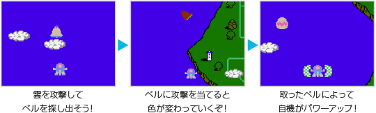 ステージ中には雲が浮かんでおり、ショットで攻撃すると、ベルが出現することがあります。このベルを取ると、ベルの色に応じてツインビーやウインビーがパワーアップするので、見逃さずに取りましょう。 ![]() ![]() |